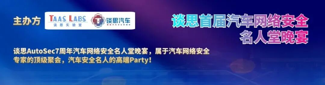 谈思AutoSec7周年年会期间将举办“ 首届汽车网络安全名人堂晚宴 ”。晚宴特邀60多位汽车网络安全大咖和专业人士共赴盛会,为大家提供了一个共叙友情、共谋发展的私享聚会,是汽车安全名人的高端Party!目前已经有近30家主流车企的网络安全相关负责人确定莅临,大半个圈子的汽车安全专家齐聚。2023年,谈思希望能与业内同仁一起,同心协力、携手共进,深化合作、互助共赢,以新思路、新模式,筑就行业新业态、新前景,继续壮大中国汽车网络安全行业生态圈。目前莅临嘉宾均属于特邀制,活动席位不售卖,每家单位仅可有1位名额,机会十分难得,收到邀请的专家请及时确认哦!