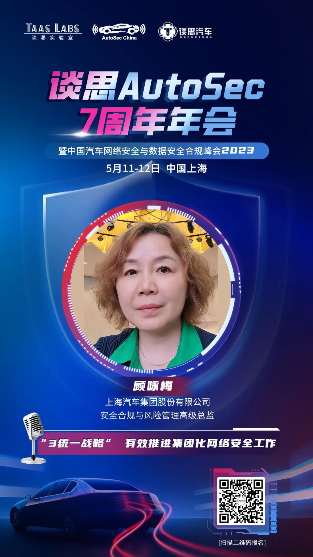 此次,上海汽车集团股份有限公司安全合规与风险管理高级总监顾咏梅女士,将在谈思AutoSec 行业7周年年会上分享“ 3统一战略” 有效推进集团化网络安全工作 ”的精彩话题。