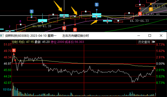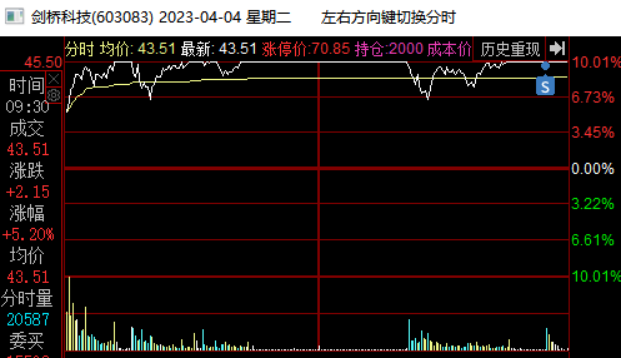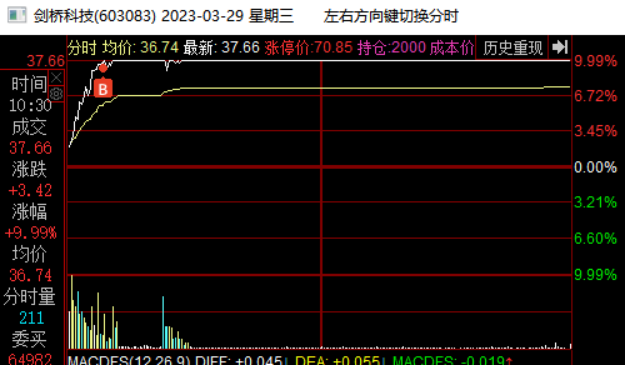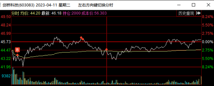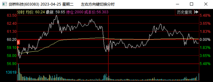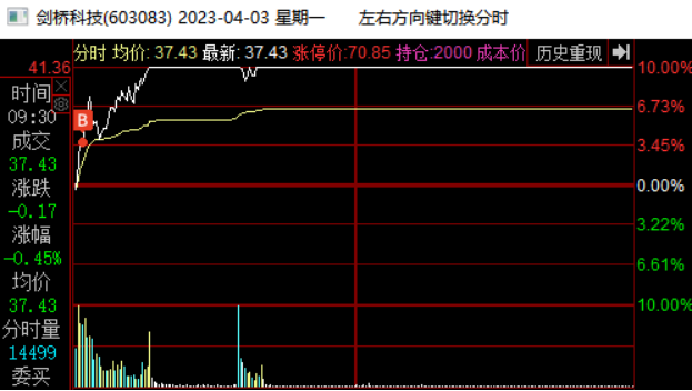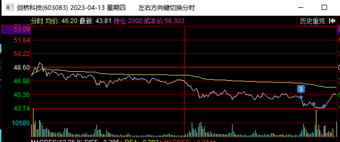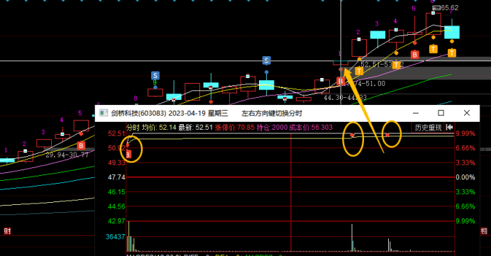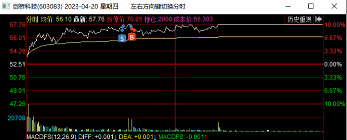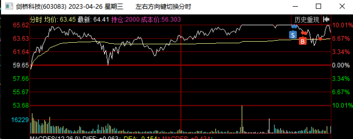 在4月13日板块指数新高后尾盘跳水,他当天低开低走震荡尾盘跌停被撬开,这里预判板块指数双头,剑桥要继续向下回踩,就在下午出清了。这里不确定向下调整到哪里,心理锚定是15日线或者20日线,所以先出来观望了。当日奥飞娱乐加速5连板,连板梯队完整,市场都在为短线接力情绪而躁动,是否会风格转变引发热议,我当天早盘也扫板了奥飞娱乐,所以这也是影响我卖出剑桥的一个因素,下午奥飞炸板,主要再纠结要不要加仓奥飞,拿这个最高空间板,犹豫了一会封死了,没去加仓。与此同时,剑桥封跌停我就把最后的仓位挂单排队了去看奥飞的封单变化了,1.8万手封单也不多,几秒钟就被大单撬开了,我都没来的及撤单,成交卖出了。但是后来看量价,剑桥没有结束,卖出后就有点后悔了,确实是恐慌了,再加上没有专心盯他,也没有拿回来,尾盘被抢到6%,尾盘卖也不错啊,哭死了。