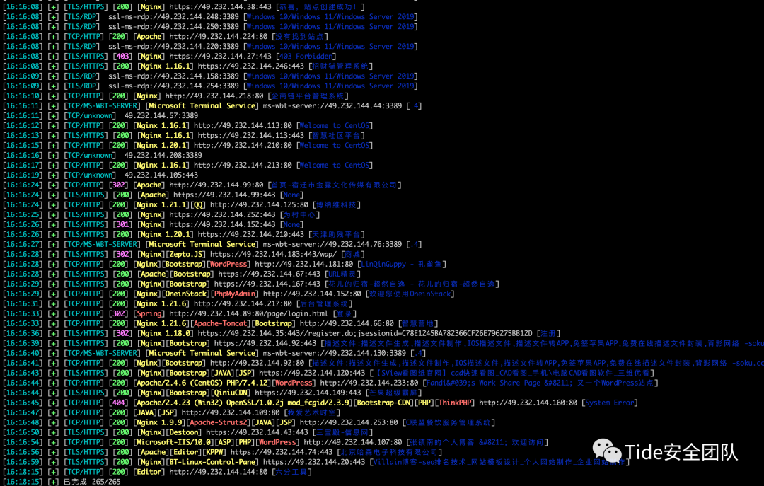 TideFinger支持多Url、IP、网段等多种探测方式,沿用了fscan的破解功能,默认会启用口令破解和poc检测功能。显示结果中对130多个红队常见CMS和框架进行了红色标注。