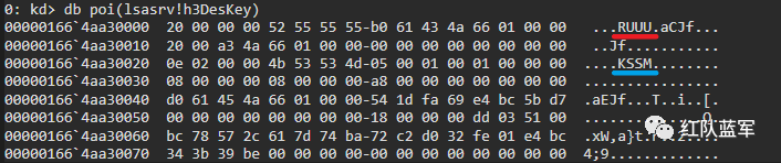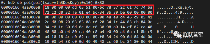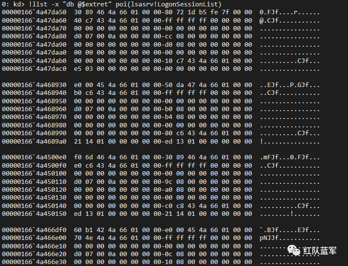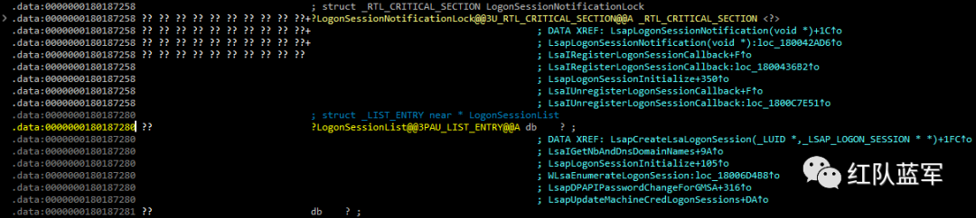 签名:上图中红色边框标出的字节序列,这一段字节序列在同一版本系统中不变,因此可以用来识别 mov r9d, cs:?LogonSessionListCount 和 lea rcx, ?LogonSessionList 指令。 LogonSessionList:在 x86_64 架构上,可以引用相对于指令指针当前值的地址。绿色边框标出的四个字节前的三个字节标记了 lea rsi 指令,边框内的四个字节保存了 LogonSessionList 变量相对于 rip 指令的偏移量。此时 rip 指向的地址为绿色边框结束的地址。 LogonSessionListCount:同理,LogonSessionListCount 变量的偏移量由蓝色边框标记出。此时 rip 指向的地址为蓝色边框结束的地址。 在这个例子中,Mimikatz先扫描出特征码的地址是 0x18006D4A4,然后加上 23 个字节定位到保存 LogonSessionList 变量的地址,取出偏移量为 0x119DC1,因此可以计算出 LogonSessionList 变量的地址为 0x18006D4A4 + Hex(23) + Hex(4) + 0x119DC1 = 0x180187280,如下图所示位置,可以看到 LogonSessionList 是一个 LIST_ENTRY 结构体,该结构会在下文中讲到。