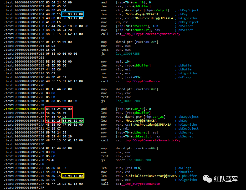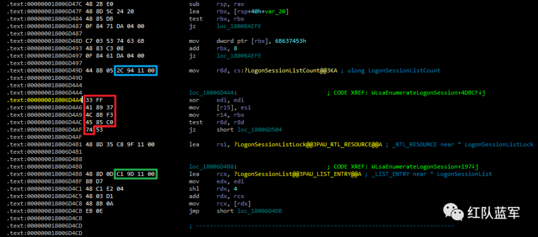 例如在 Windows 10 x64 1903 系统中,Mimikatz 扫描下图红色边框标出的特征码,以识别 mov r9d, cs:?LogonSessionListCount 和 lea rcx, ?LogonSessionList 指令。在 x86_64 架构上,这些指令使用 rip 相对寻址来访问和使用全局变量,下图中的蓝色和绿色边框标出的字节序列,即为指令所保存的 LogonSessionList 和 LogonSessionListCount 相对于当前指令的偏移量(小端序)。