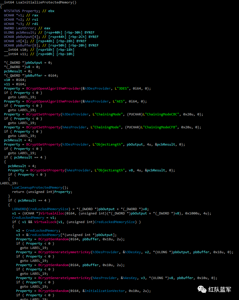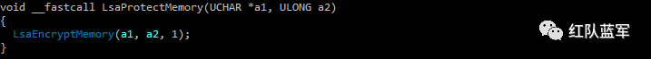 这里先将包含凭据的加密内存地址赋给 msvCredentials,然后对这块内存调用 lsassLocalHelper->pLsaUnprotectMemory 指向的函数,在这里是 kuhl_m_sekurlsa_nt6_LsaUnprotectMemory() 函数,该函数定义如下。