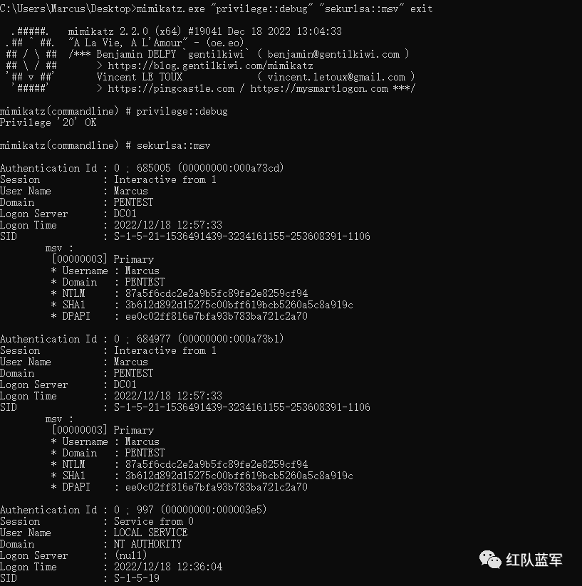 Mimikatz 的 sekurlsa::msv 功能可以在线从当前主机的 lsass.exe 进程中枚举哈希(LM & NTLM)凭据。