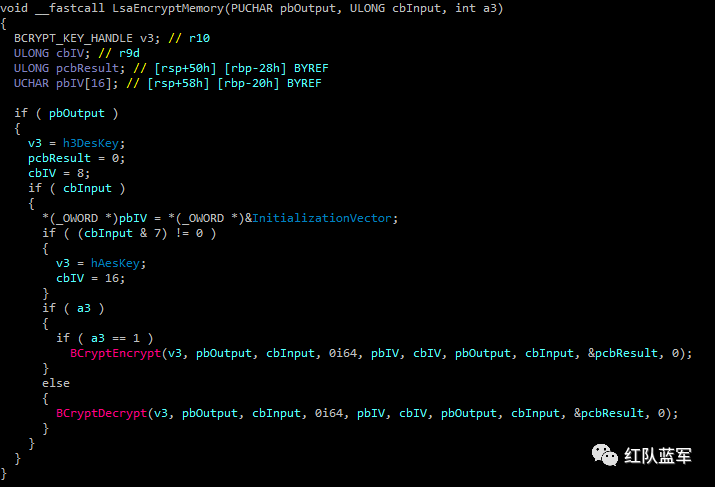 跟进 kuhl_m_sekurlsa_nt6_LsaEncryptMemory() 函数,如下所示,该函数对 BCryptEncrypt() 和 BCryptDecrypt() 函数进行封装,二者利用提供的初始化向量和密钥,分别对指定内存的数据块进行加密和解密。
