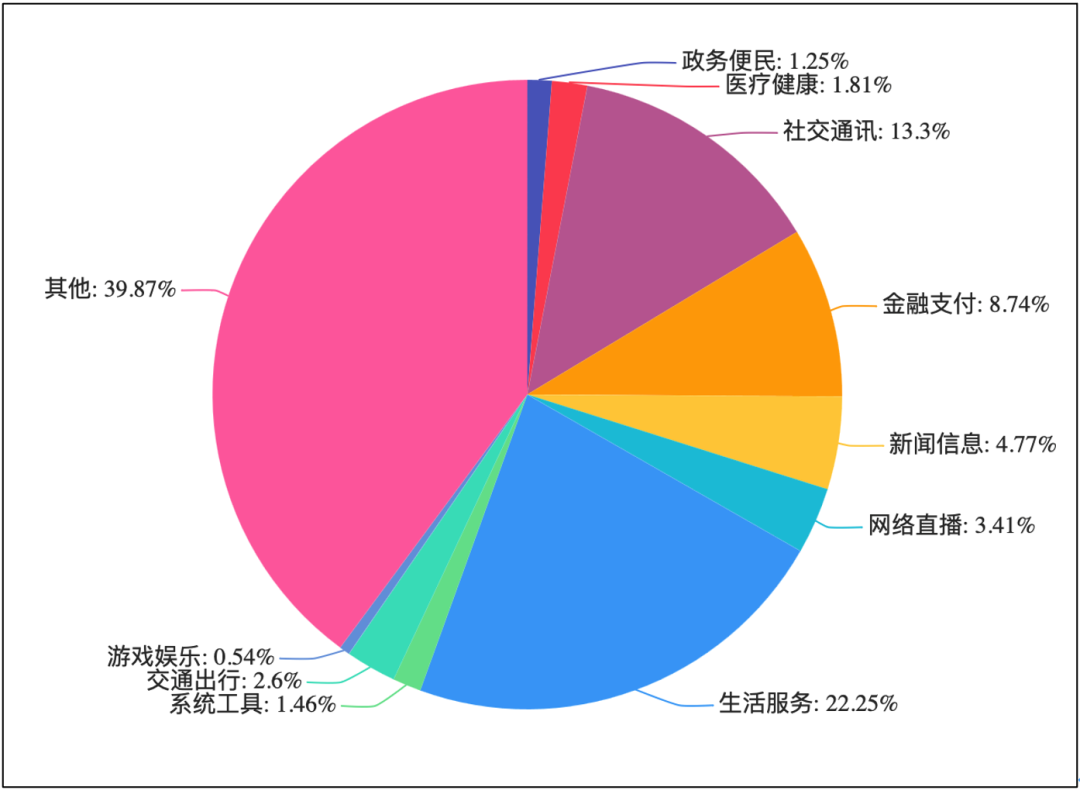截止2023年04月底,通过潮启移动端安全管控平台共监测到山东省移动应用数量为11171款(不含历史版本),通过对移动应用行业分布数据追踪发现,目前山东省移动应用行业数量排名靠前的为生活服务类,约2464款,较3月份新增3款;社交通讯类约1473款,较3月份新增3款;金融支付类约968款,新闻信息类约528款,较3月份新增2款。