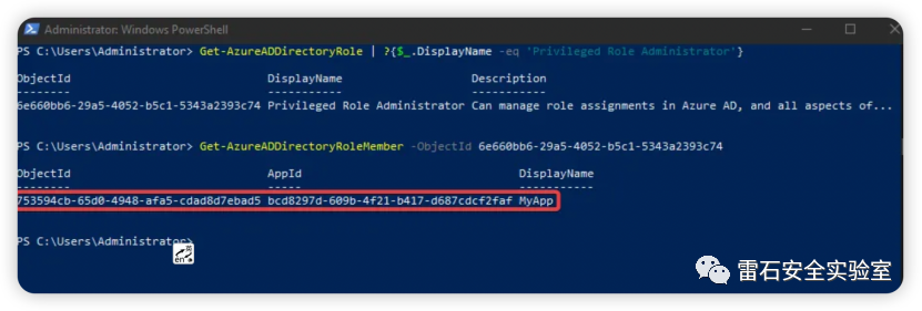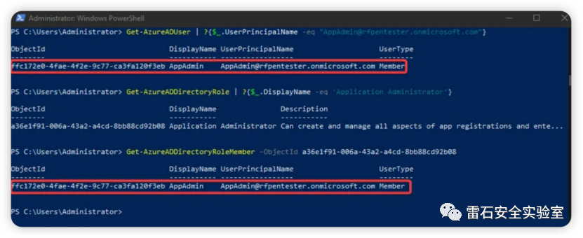 Get-AzureADDirectoryRoleMember -ObjectId "OBJECT_ID" #Comparing Object ID of Application Administrator Member to the user