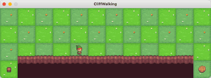 上面的策略描述可能比较抽象,可以举个例子,比方我们在玩下面这个悬崖漫步(Cliff Walking)游戏的时候,我们的目的是从左下角走到右下脚,当前状态是下面这个位置,那么我的行动可以有三种:向左、向右、向下,那么该选择哪种行动以达到我们的游戏收益的最大化就是策略。