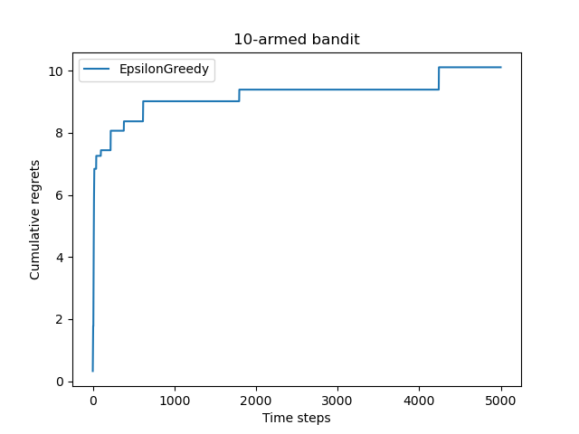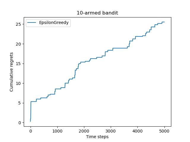 但是如果 ε 的值一直不变也是会有问题的,其实也很容易想到,假设 ε 设定为 0.1,那么再怎么最优也有 10%的概率是随机的,那么我们在上面提到了 被称为悔恨度(regret), 一定会随着实验的次数不停增长: