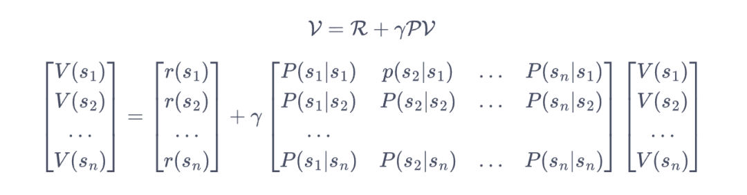上式就是马尔可夫奖励过程中非常有名的贝尔曼方程(Bellman equation)。我们将所有状态的价值表示成一个列向量,于是我们可以将贝尔曼方程写成矩阵的形式: