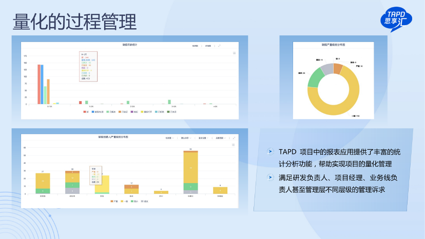 此外,TAPD开放平台可以通过API实现各种形式的定制化管理,从宏观角度出发,获取各类数据进行聚合,主要是展示一些项目情况,公司资源的投入情况,尤其是研发资源的分布,综合分析公司的项目资源,为一些决策做支撑。![]()