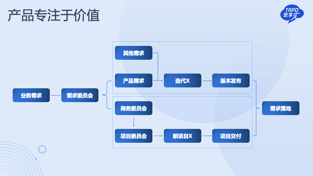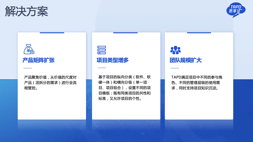 1、面对产品的扩张,聚焦在产品价值,从产品价值可量化的尺度出发进行全流程管控。产品的价值,是指我们在新开发一款产品,能够解决客户某一类问题,从而创造直接的财务价值,带来收入增长;或者一个产品能满足客户的需求,虽不能直接提升收入,但该产品有利于我们生态的建设;或者该产品具备同类型客户可复制特性,那这个产品功能也是有其价值。2、针对项目数量和类型的增加,基于项目横纵向进行分类分级,并设置相应的项目模板。我们会将项目进行分级分类,每一个具体类型都会以模板的形式固化下来,立项通过之后直接创建。TAPD具备父子项目相关能力,通过在TAPD里面直接创建项目,既拥有同类项目的共性和标准,又允许项目存在个性化。3、面对团队规模的扩大,通过TAPD自定义不同角色的工作流,同时沉淀项目资产。我们通过TAPD多工作流及wiki等相关功能,自定义不同角色的研发协作流程,其次结合开放的API接口将项目生产数据集成到自建的系统中,进行定制化的统计分析。我们在TAPD创建专属的需求洞察评审项目,专门管理经过需求委员会评审的需求。需求提出方需要对需求背景、内容以及其他相关情况做简单且全面的说明,需求委员会通过必要性、收益性、可行性等3个维度评估需求的价值,确定哪些需求待落地以及其优先级。