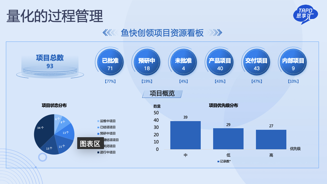 团队规模的扩大对于团队管理,尤其是新成员能否快速融入项目生产工作提出了一定的挑战。TAPD项目文档功能,囊括项目所有角色所需文档和分类分级,实现资料的分享和归档,使内部知识传播和信息对齐,汇聚成组织的知识沉淀。TAPD中的Wiki和文档是我们项目知识外显化和连接化的一个重要工具,有了丰富的项目知识的沉淀,能够减少团队成员变化对项目执行的不利影响。通过TAPD工时统计来衡量产研资源的投入,我们超过80%的人力资源是投入到软硬一体的项目组合管理中,避免对重点复杂项目资源投入的不足。另外通过价值评审流程聚焦资源投入,近3月通过价值评审流程重点投入的需求占原先需求的60%,相比较以往,我们减少了40%的“浪费”,保障资源投入的有效性。同时接近95%的项目已建立起属于自己的知识库,我们正在对这些知识库进行总结和归纳,不久将建立起组织过程资产基线。总体而言,TAPD帮助鱼快创领实现了从0到1的跨越。鱼快创领从成立之初就开始使用TAPD,我们使用TAPD建立了产品开发和项目立项的流程,我们的产品从0-1开发,我们项目从0-1实现落地。目前TAPD满足我们大部分需求,包括日常的敏捷项目管理中的需求管理、缺陷管理、测试管理、发布管理等;同样支撑起我们组织内部一部分的事务管理。对于鱼快创领,TAPD已经超越了"Agile Product Development"。同时我们也不断提出一些完善性需求给TAPD,帮助TAPD产品功能逐步丰富,相信在未来TAPD将会更具竞争力和吸引力。此外,TAPD支撑鱼快创领实现了从1-100的提升。标准的项目管理规范,有利于提升产品价值的交付能力,帮助提升产品和项目的质量。两年多来,TAPD帮我们解决了很多困难,已经成为我们信任和依赖的项目管理工具。TAPD就像我们鱼快创领的一盏车灯,我们一起驶向更远的前方。