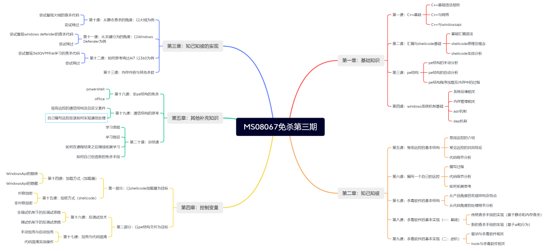 我希望课程学习完成后,大家不仅能够学到我们教过的免杀知识,更重要的是能自己创造新的免杀方式,而要做到这一点,就需要将免杀知识分为不同的知识体系,在实战中我们就可以通过控制变量的方式去实现,这套课程希望不仅在技术上能够带给大家提高,更能在思想上带来一个质的飞跃!
