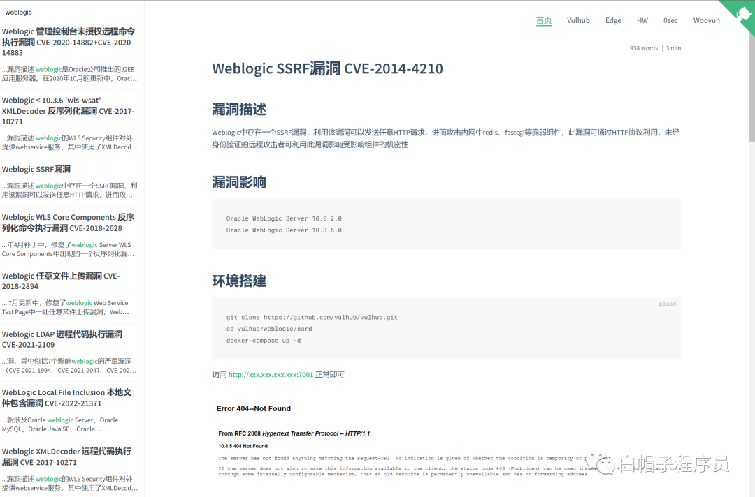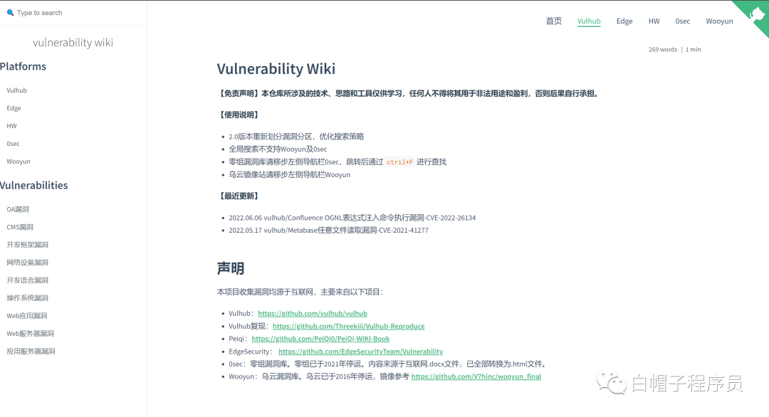一个知识库,集成了Vulhub、Peiqi、EdgeSecurity、0sec、Wooyun等开源漏洞库,涵盖OA、CMS、开发框架、网络设备、开发语言、操作系统、Web应用、Web服务器、应用服务器等多种漏洞。