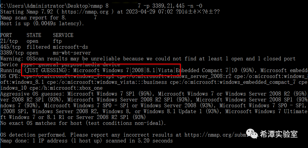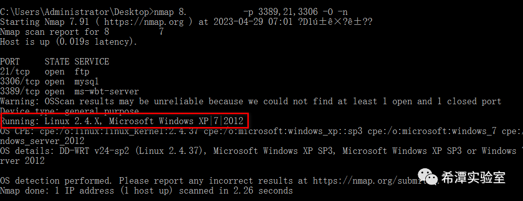 使用nmap 8.131.x.x -p 3389,21,445 -n -O命令对一个windows主机进行探测,在NAT模式下nmap判断操作系统结果如下,明明是windows系统,NAT下居然判断成了linux系统: