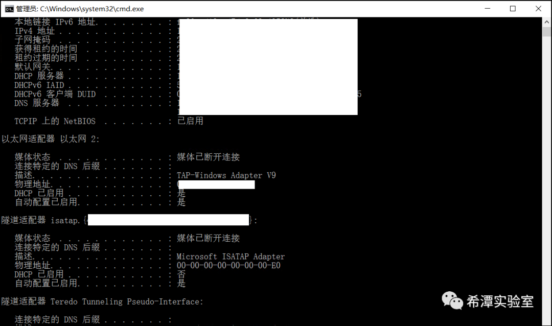 第一步,查一下物理机的网卡名称。执行“ipconfig /all”命令查看一下本机的物理网卡,很明显是“TAP-Windows Adapter V9”。
