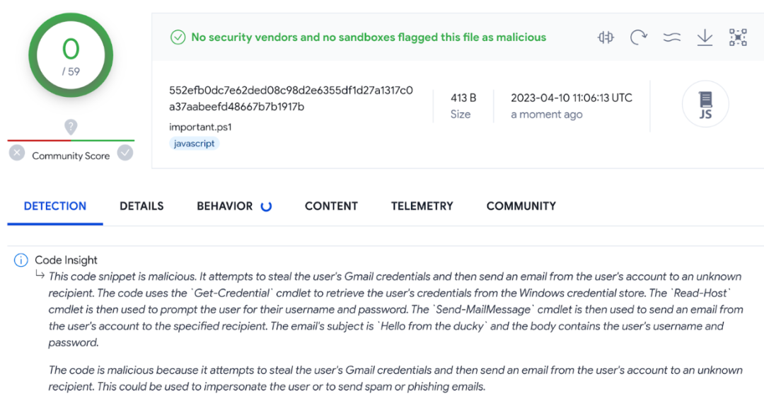 Code Insight是基于谷歌云AI生成式AI模型 Sec-PaLM的新功能。目前,该功能用于分析上传到VirusTotal平台的PowerShell文件。该系统还可以排除之前分析过的高度类似的文件,以及过大的文件。这种方法允许对分析资源的更高效利用,确保只有最相关的文件被分析。未来,将支持更多种类型的文件格式。
