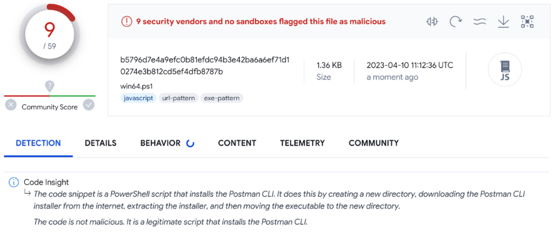 比如,有一个文件被9个杀毒引擎识别为木马和恶意软件,但事实上是假阳性。Code Insight的解释就可以帮助预防此类情况,事实上该文件只是一个安装Postman CLI的脚本:
