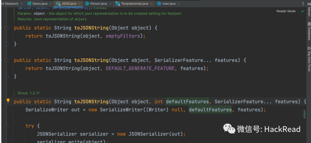返回结果可知:parseObject("",class) 会识别并调用目标类的特定 setter 方法及某些特定条件的 getter 方法