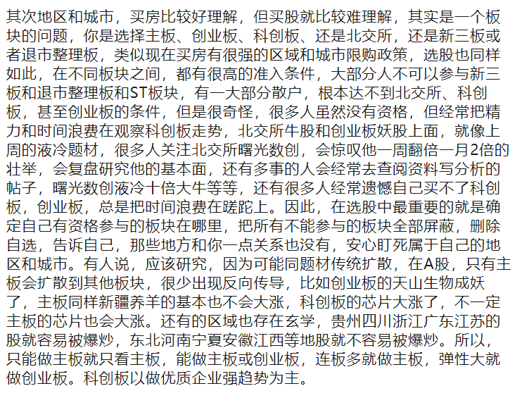 文化传媒、游戏、液冷等等,疫情防控也有抗生素、口罩、呼吸机、核酸检测、疫苗、特效药等。不同的分支就是不同的楼盘,选准了分支才能选到自己称心如意的好股票,你无法在AIGC中选到剑桥科技,就算你看到剑桥科技涨,你却盯着AIGC,你也会觉得他是杂毛,不屑一顾。同类你一直盯着CPO,你也无法理解为什么文化传媒和游戏就怎么涨起来了,中国科传和上海电影怎么成了中文语料了。所以,分支之间的切换和轮动,是选股动态调整的重要盘感。第六类型户型,选股选定赛道选定分支之后,就要选择具体股票的属性、盘子大小、产品和服务的特点,市场关注点的契合度,比如人工智能中算力板块,市场目前主流是大屁股的