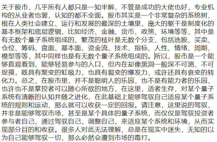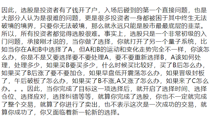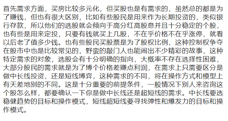 中国电信、中国移动等国资云呢,还是更加倾向于小盘次新股呢,还是倾向于服务器的浪潮和拓维,是更倾向于华为系、腾讯系还是阿里系,很多时候,浪潮涨不表示中国电信在涨,中国移动虽然是算力云,但前段时间暴涨只是锚定了贵州茅台的股王争霸,拓维被华为国产替代吹牛吹起来,鸿博股份的英伟达就被打下去了。在选股中,拥有多属性的个股相对更好,或者是有朦胧感看不清又有股市的个股也比较优秀,比如目前人工智能大模型的昆仑万维。第七方位楼层开发商,这个就属于产品个体的基本面了,也是选股中比较重要的基本面问题,产品具体的技术层级、公司企业的情况,在市场中的地位,市场占有率,利润率,合同签订情况等等,这种就属于微观化的选择。虽然从商业的角度来看,产品个体本身应该更加重要,但是房子由于是真实的实体,因此选房这个因素也会占据很重要的分数,但股票是虚拟的,他并没有具体的产品到你手上,所有关于产品本身还是企业本身,都是表现在认知传导到情绪反馈方面的,简单说,是能不能吸引资金的一个因素。在股市里,你产品好,未必股价就会涨,签了大合同也可能是利好落地兑现的好机会。个股基本面最后还是落脚到业绩上,其实基本面要素虽然非常繁多,但很多都是可以造假的,包括业绩也是可以造假的,而且是动态的,在整个股市中真正有稳定高速业绩增长的股票凤毛麟角,而且大部分是明牌。