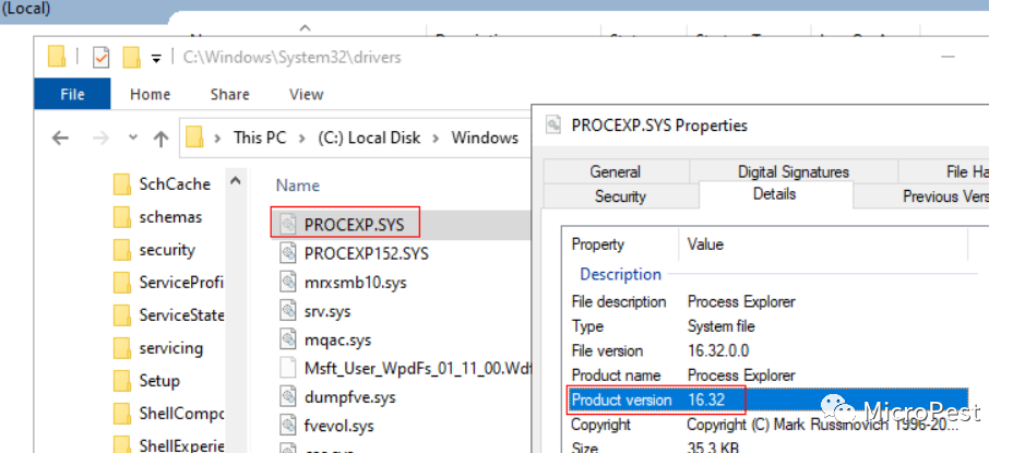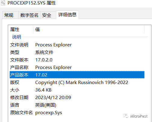 我看了下最新版的ProcExp152.sys的版本信息为:17.02,位于c:\windows\system32\drivers下;而BackStab自带的ProcExp.sys的版本信息为:16.32;
