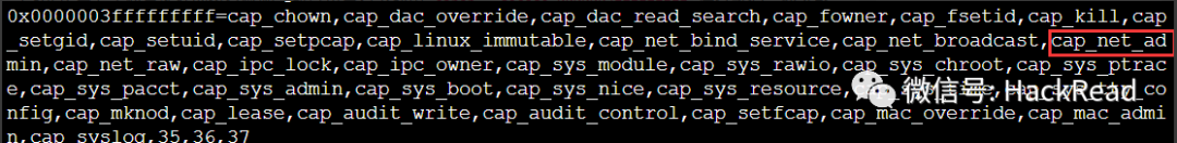 CapEff 主要是检查线程的执行权限,所以重点看下利用 capsh --decode=0000003fffffffff 进行解码,检索默认没有添加的 NET_ADMIN,发现存在