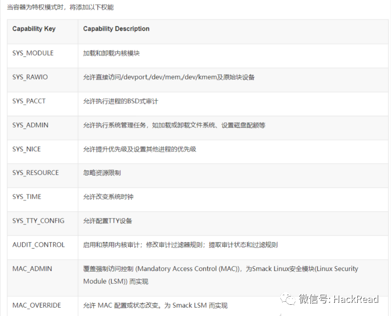 当容器为特权模式时,将添加如下功能:使用指南 - 特权容器