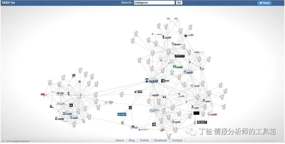 Reddit可视化:http://www.yasiv.com/redditReddit Visualization是一个可视化发现工具,使调查人员能够在链接分析图表中查看子Reddit之间的连接。要使用Reddit可视化,在搜索栏中输入一个子Reddit名称,并点击放大镜按钮或更改子Reddit名称在以下红色URL的末尾:http://yasiv.com/reddit#/Search?q=intelligence.d![]()