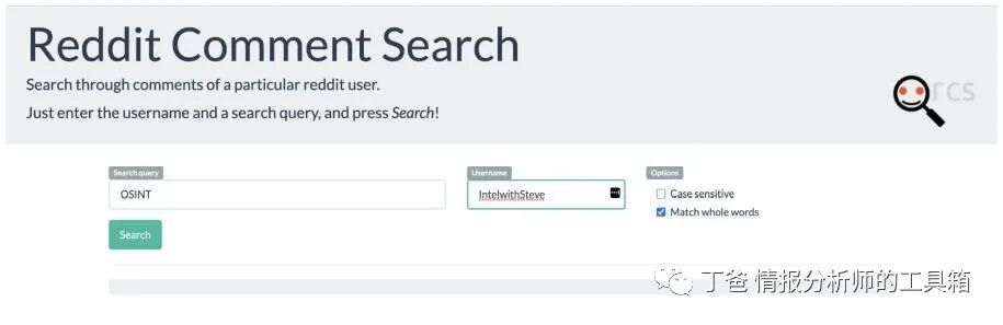 Reddit评论搜索使调查人员能够搜索特定用户的评论Reddit的用户。要使用Reddit评论搜索,在“用户名”字段中输入相关的用户名和“搜索查询”字段中的关键字或短语,然后按“搜索”按钮。