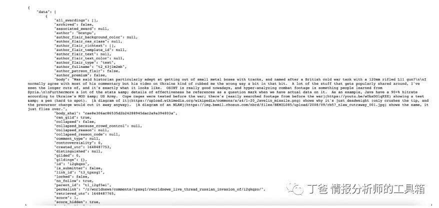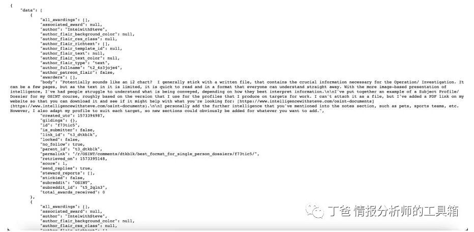 Pushshift API评论搜索以JavaScript格式提供多达100条包含特定关键字的评论。要检索包含关键字的评论,请在上述URL中编辑关键字,例如https://api.pushshift.io/reddit/search/comment/?q=osint