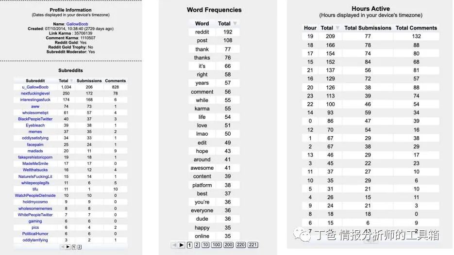 RedditMetis为调查人员提供了Reddit用户账户历史中最近1000条评论和1000条提交的列表,以及用户统计数据。RedditMetis还通过使用自然语言处理技术分析评论来推断Reddit用户的属性和财产。要使用RedditMetis,请在数据输入搜索字段中输入用户名,然后点击“分析”按钮。