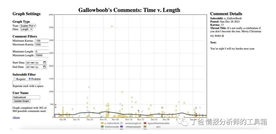 https://roadtolarissa.com/javascript/reddit-comment-visualizer/Reddit评论可视化器,也被称为图表Reddit评论,使调查人员能够通过使用Reddit的API提取用户的评论,并在散点图中绘制它们来查看Reddit用户的活动。要使用Reddit评论可视化器,在页面顶部的搜索栏中输入Reddit用户名,然后点击“下载和图表”按钮。![]()
