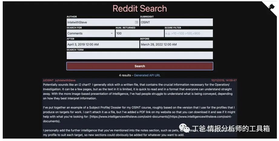 调查人员可以通过将“关键字”替换为上述URL中的相关主题来搜索包含特定单词的主题风格的帖子,例如https://www.reddit.com/search?q=flair: osint