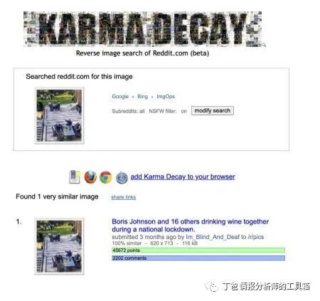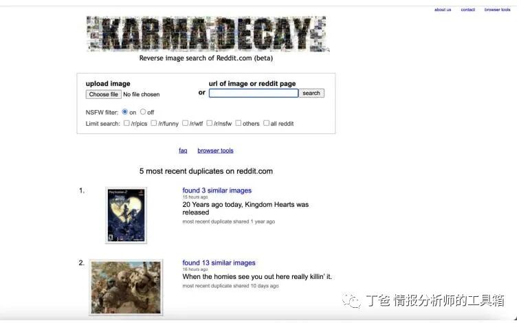 Karma Decay是一个反向图像搜索平台,用于搜索Reddit平台内的图像实例,确定该图像之前是否已发布到Reddit。要使用Karma Decay,请单击“选择文件”按钮并从设备中选择图像,或将图像的URL输入“URL图像或reddit页面”数据输入字段并点击“搜索按钮”。