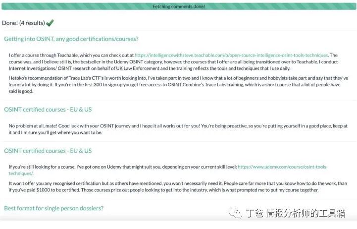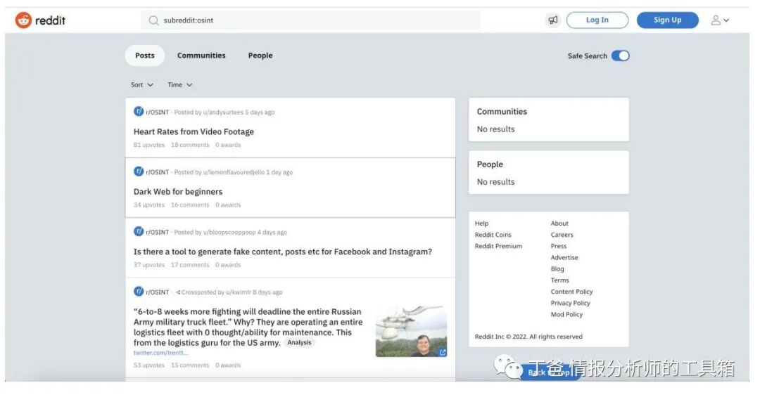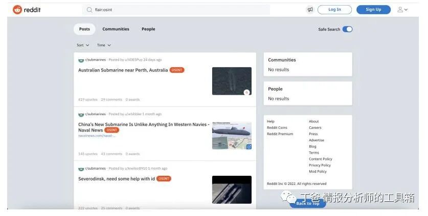 调查人员可以通过关键字搜索subreddits,将“关键字”替换为上述URL中的相关主题,例如https://www.reddit.com/search/?q-subreddit%3Aosint![]()