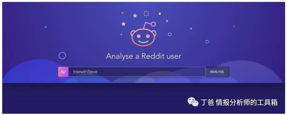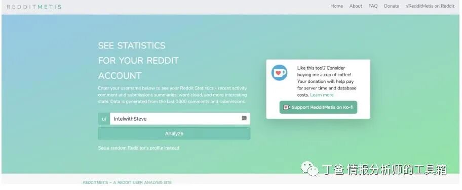 Reddit用户分析器使调查人员能够分析Reddit用户的活动。要使用Reddit用户分析器,请在搜索字段中输入用户名并点击“analyze”按钮。