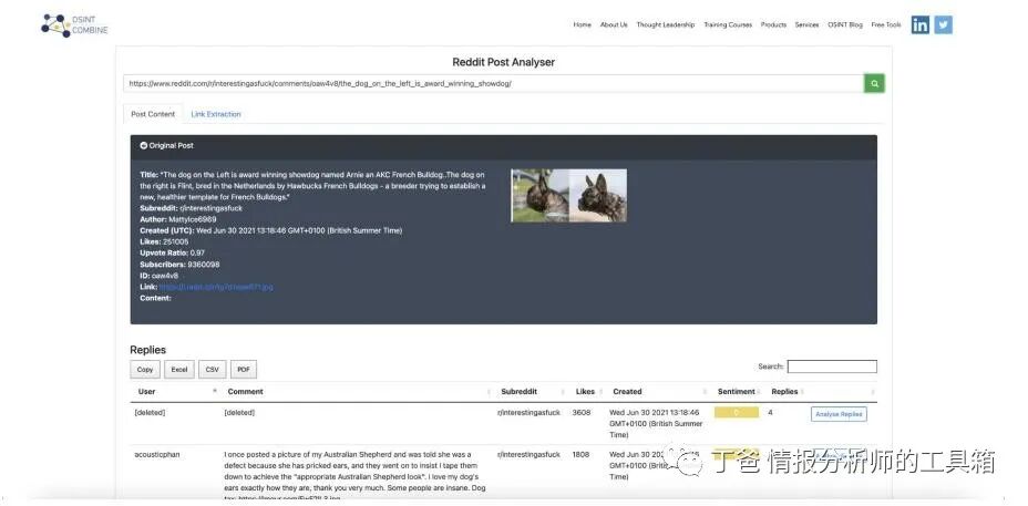 https://www.osintcombine.com/reddit-post-analyserReddit帖子分析器是OSINT组合的一个工具,使调查人员能够检索和审查Reddit帖子。要使用Reddit帖子分析器,输入Reddit帖子的URL并点击绿色放大镜按钮。结果将填充在数据输入搜索字段下面。![]()