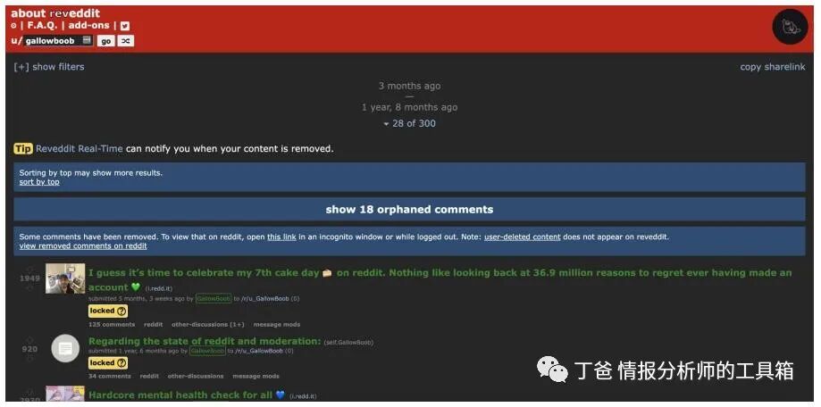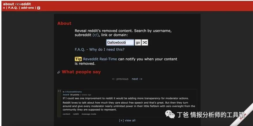revreddit使调查人员能够从Reddit平台检索删除的内容。要使用revedit,请在数据输入字段中输入用户名,然后点击“go”按钮。