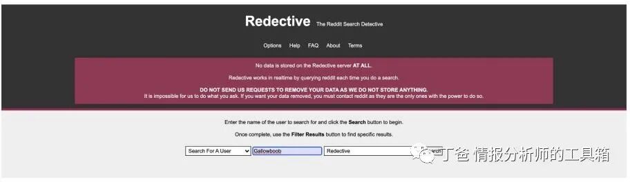 Redective为调查人员提供有关Reddit用户和子Reddit结果的信息。要使用Redective,请在数据输入字段中输入用户名或关键字,从下拉框中选择正确的搜索条件,然后点击“搜索按钮”。