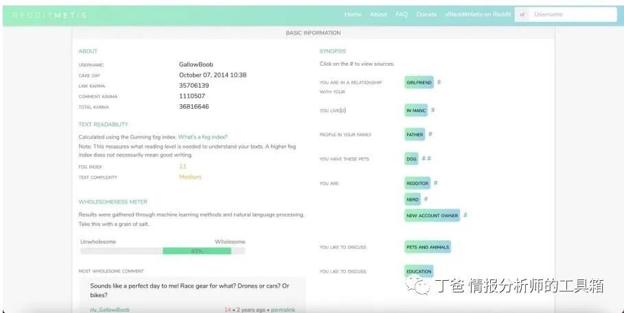 结果将填充在新页面上。调查人员可以通过定制URL https://redditmetis.com/user/username