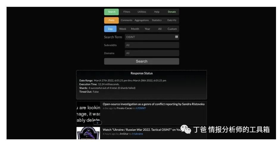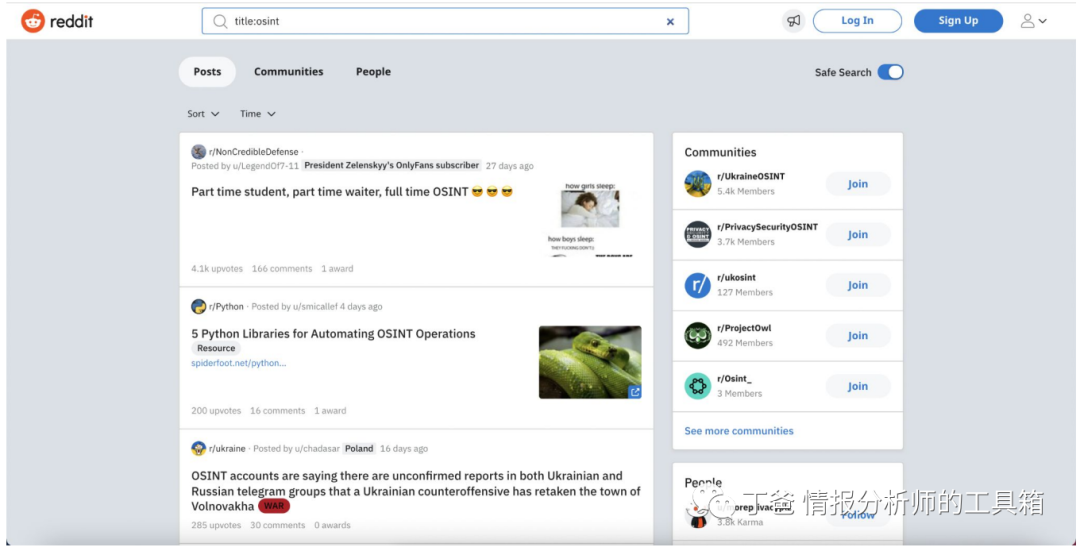 调查人员可以通过将“keyword”替换为上述URL中的相关主题(例如https://www.reddit.com/search/?q=title%3Aosint)来搜索包含主题关键字的帖子。
