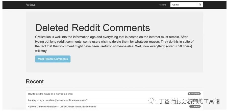 ReSavr :https://www.resavr.com/ReSavr是另一个使调查人员能够从Reddit平台检索被删除内容的平台。要使用ReSavr,请在页面右上角的搜索栏中输入用户名,然后点击放大镜按钮。![]()
