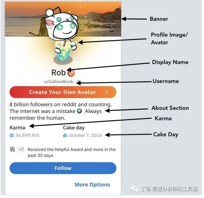 Reddit用户有一个个人资料页面,可以捕获他们的用户名、显示名称、简介、个人头像、横幅、帖子、评论和生日等内容。Reddit用户可以通过网页浏览器或移动应用程序轻松访问内容。与许多社交媒体网站不同,Reddit不限制用户在没有账户的情况下查看平台上的活动,但只有用户可以发帖或与帖子互动。Reddit个人资料页面包含在格式为https://www.reddit.com/user/username的url中,例如https://www.reddit.com/user/GallowBoob/![]()